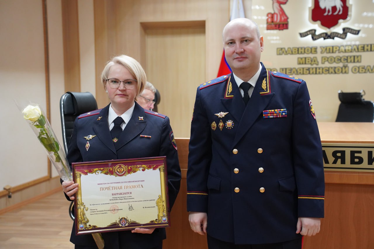 Почетной грамотой МВД России награждены начальник отдела ФКУ «Центр хозяйственного и сервисного обеспечения ГУ МВД России по Челябинской области» майор внутренней службы Вера Кобзева и старший оперуполномоченный Центра по противодействию экстремизму ГУ МВД региона.