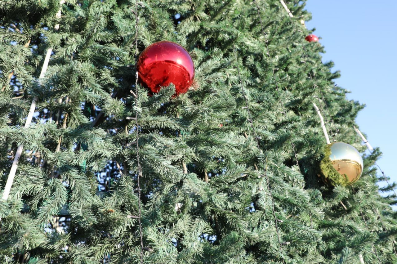 Возвели и главную новогоднюю елку, на которой в лучах осеннего солнца переливаются большие красные и золотые шары.