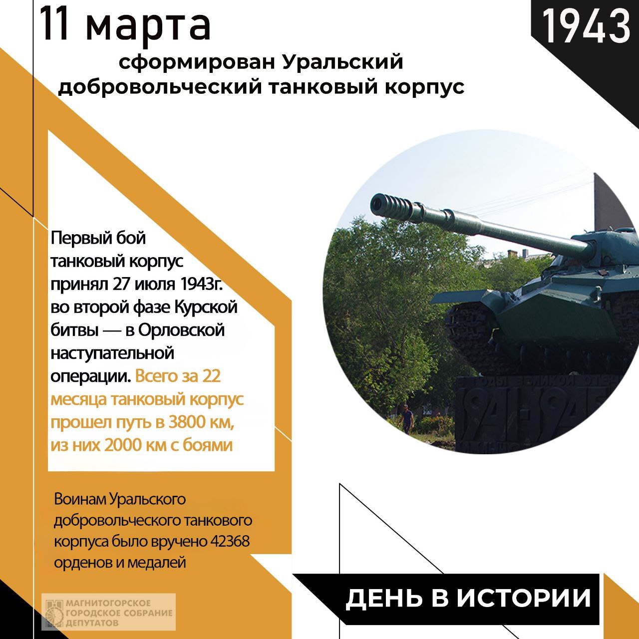 83 года назад, 11 марта 1943, во время Великой Отечественной войны, был сформирован Уральский добровольческий танковый корпус. Добровольческий танковый корпус стал уникальным подарком от трудящихся фронту. «11 марта — День народного подвига по формированию Уральского добровольческого танкового корпуса...», - написал сегодня губернатор Алексей Текслер.