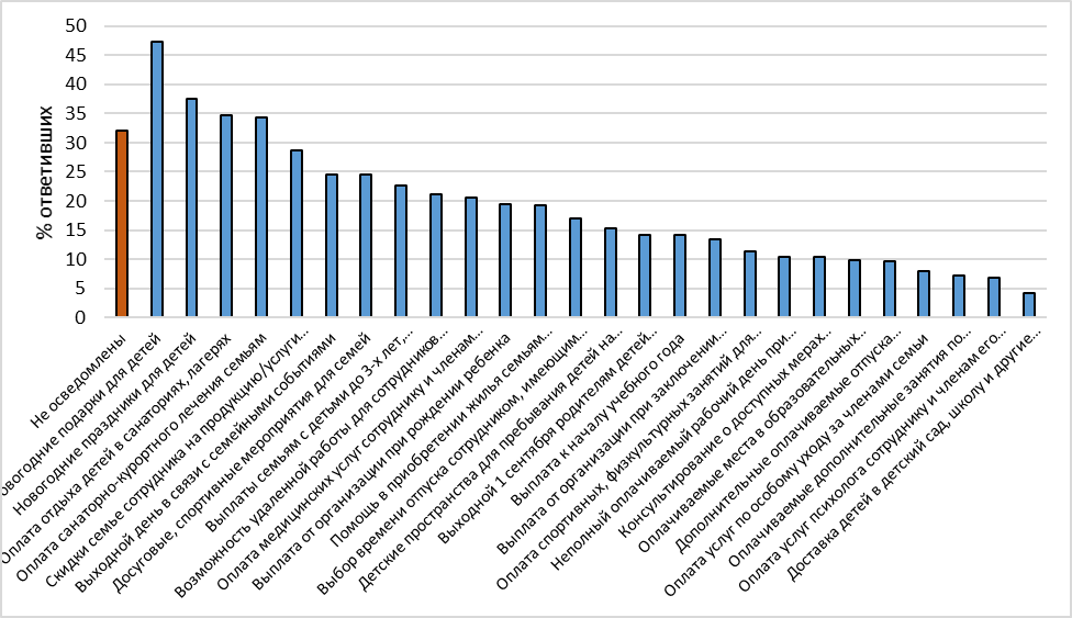 По результатам анкетирования, студенты предпочли бы помощь в приобретении жилья, обучении себя и детей, в повышении квалификации, дополнительные выплаты в период отпуска по уходу за ребенком, добровольное медицинское страхование, льготные медицинские услуги. Сегодня государство и крупные работодатели в определенной мере закрывает такие потребности, но 37% опрошенных студентов об этом не знают.