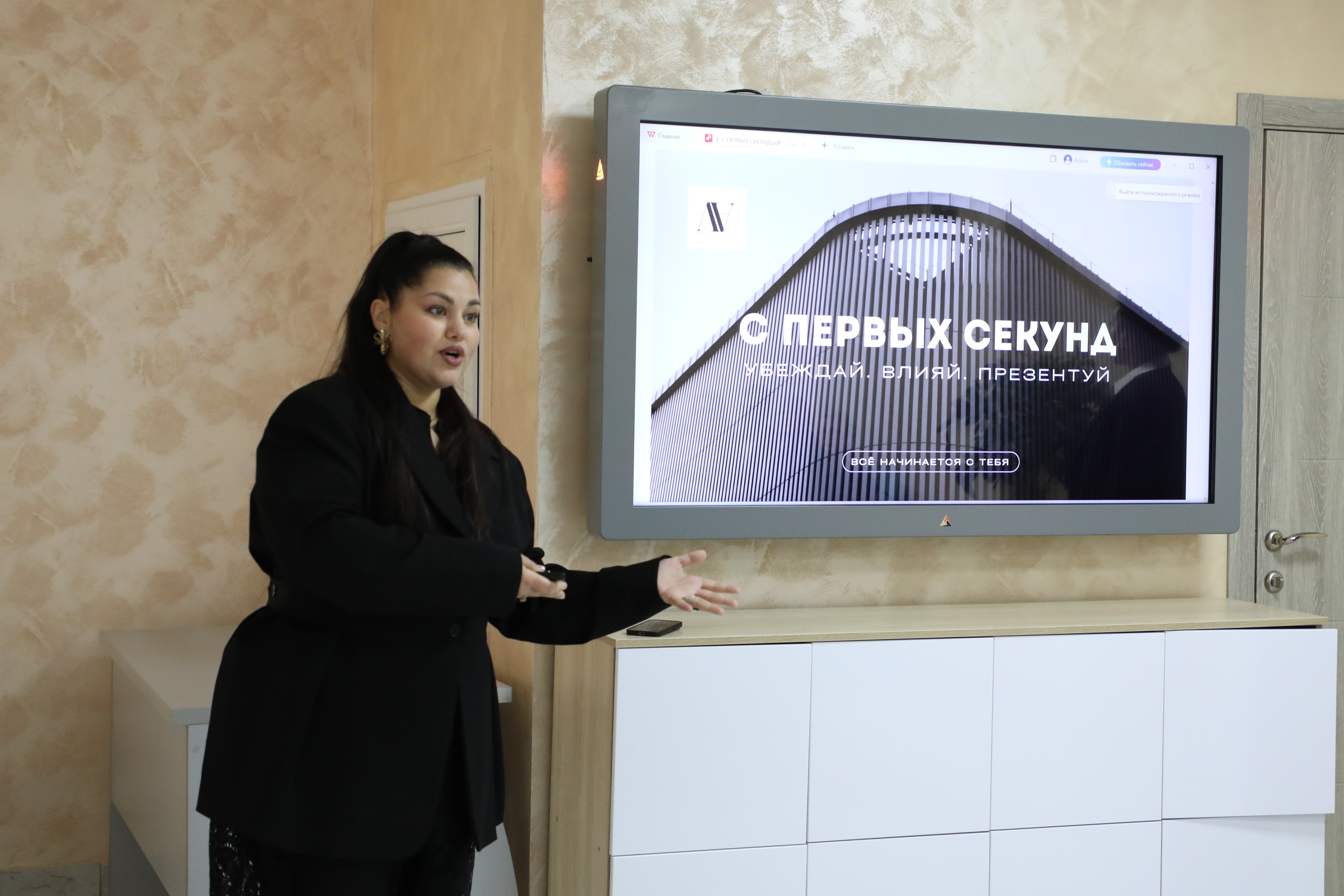 Кроме того, для присутствующих была подготовлена интересная деловая игра. Преподаватель по технике речи и публичным выступлениям Лейла Аль-Отоом совместно с актрисой Магнитогорского академического драматического театра имени А.С. Пушкина Ольгой Гущанской провели мастер-класс по успешной самопрезентации.