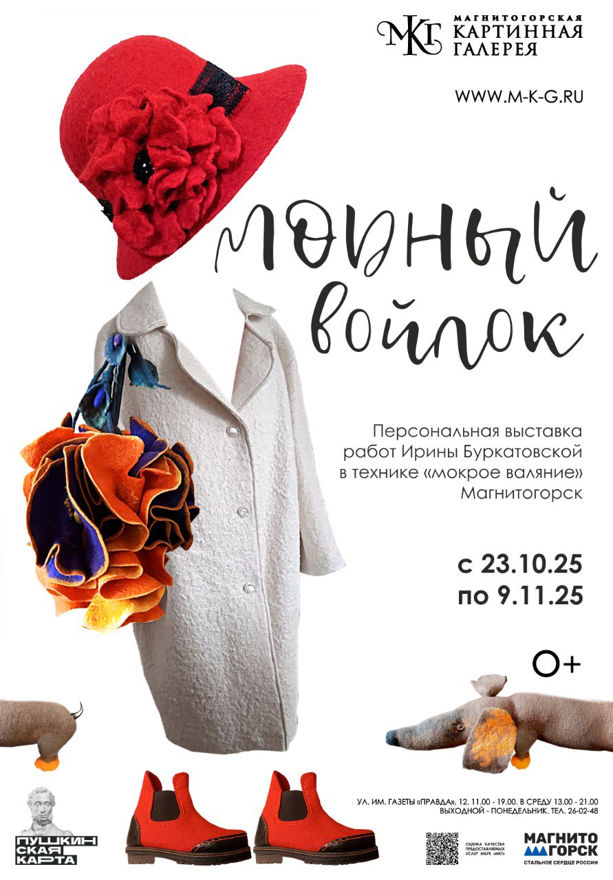 «Модный войлок» - это персональная выставка Ирины Буркатовской. Автор работает с войлоком в технике «мокрое валяние» с 2011 года и создала уже внушительную коллекцию, которой хотела бы поделиться с магнитогорцами.