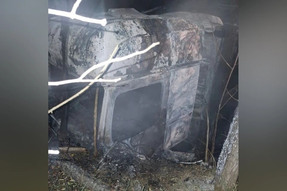На объездной дороге вокруг Магнитогорска ночью 24 октября случилось ДТП с пожаром. Грузовой Mercedes скатился с дороги в реку Малый Кизил. Кабину фуры объяло пламя.