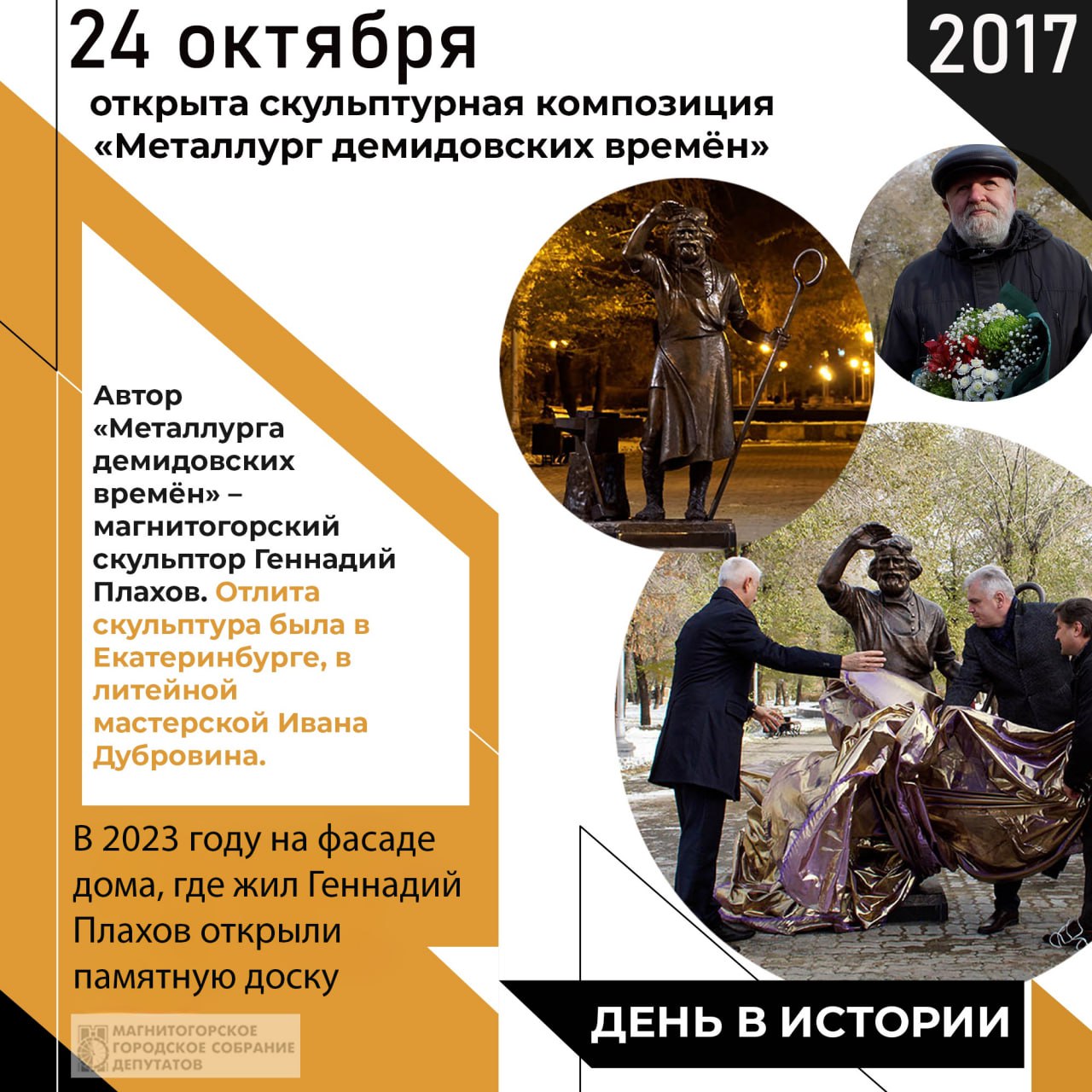 8 лет назад, 24 октября 2017 года, в Магнитогорске, в сквере на проспекте Металлургов, была открыта скульптурная композиция «Металлург демидовских времён», изображающая рабочего-металлурга XVIII века, стоящего рядом с орудиями своего труда и всматривающегося вдаль — на запад.