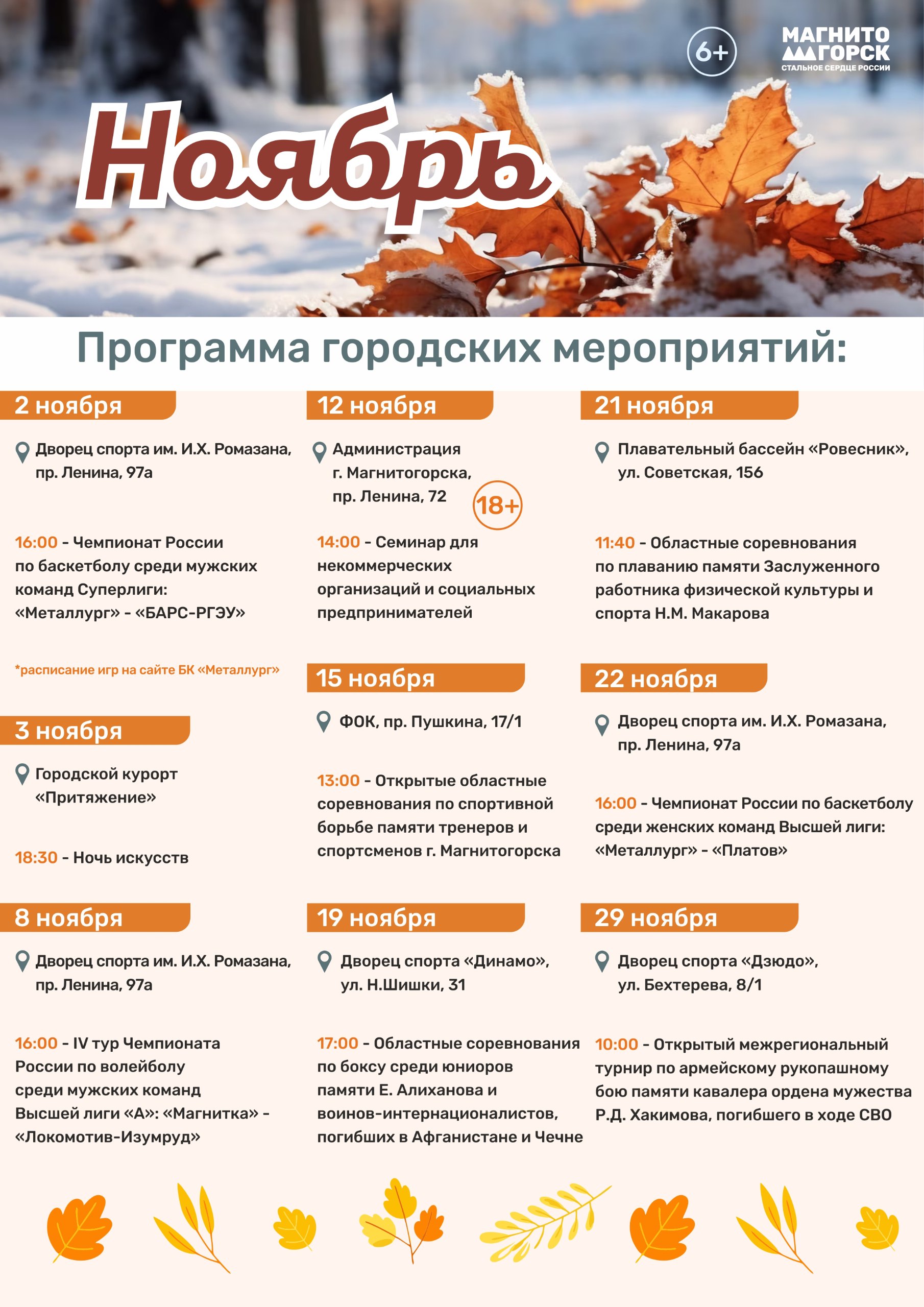 Различные соревнования, тематические встречи - эти и другие городские мероприятия ожидаются в ноябре