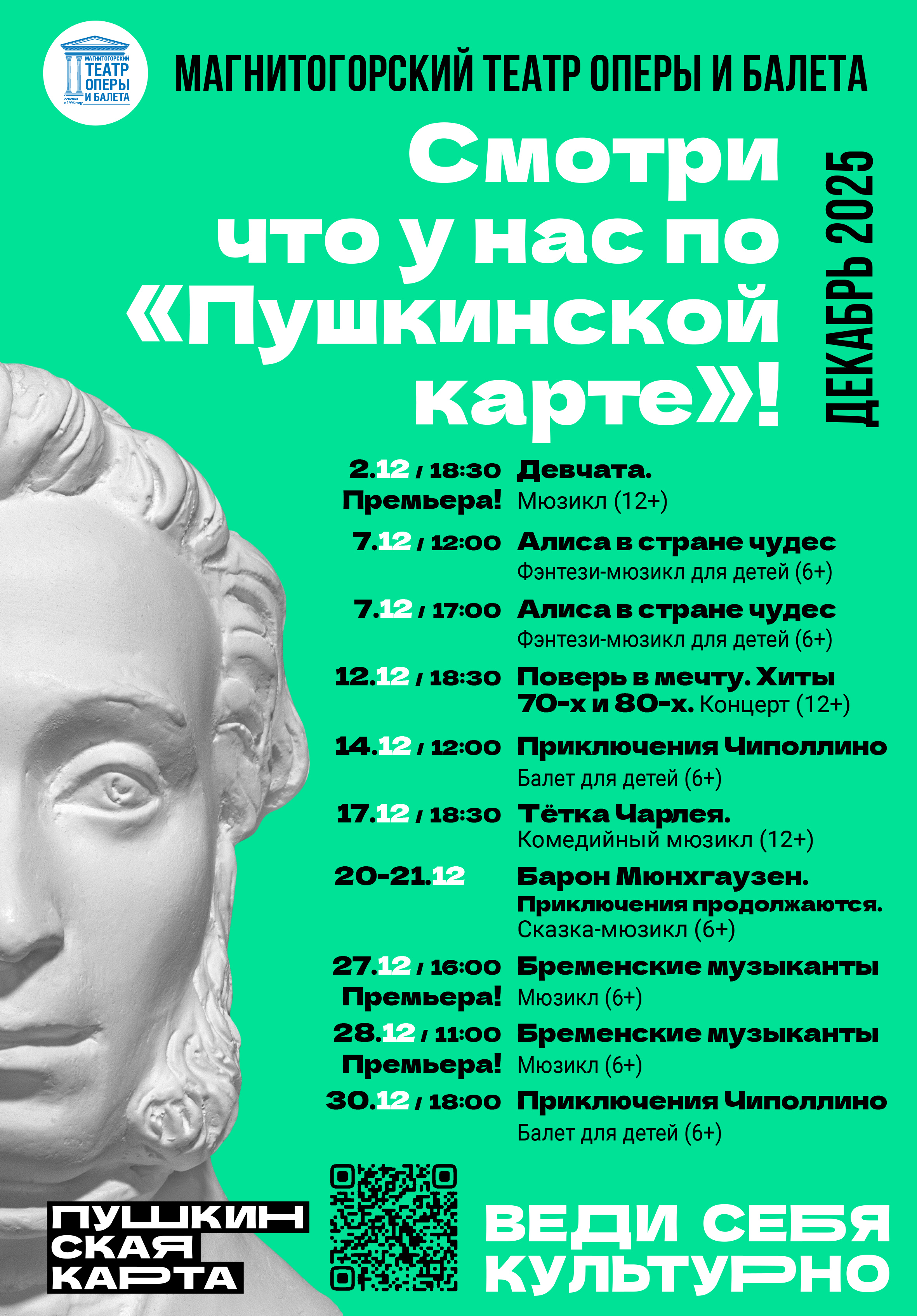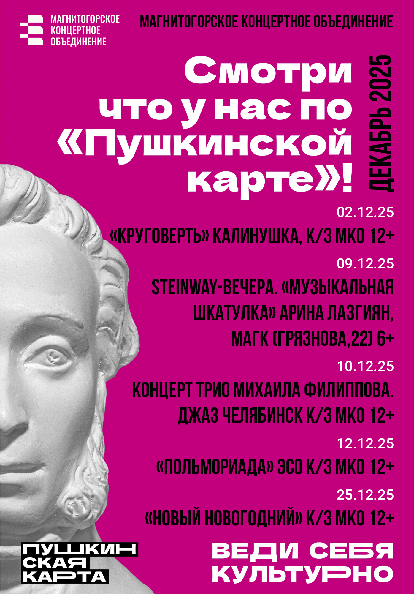 С мероприятиями, доступными по «Пушкинской карте» молодым магнитогорцам в декабре, можно ознакомиться ниже.