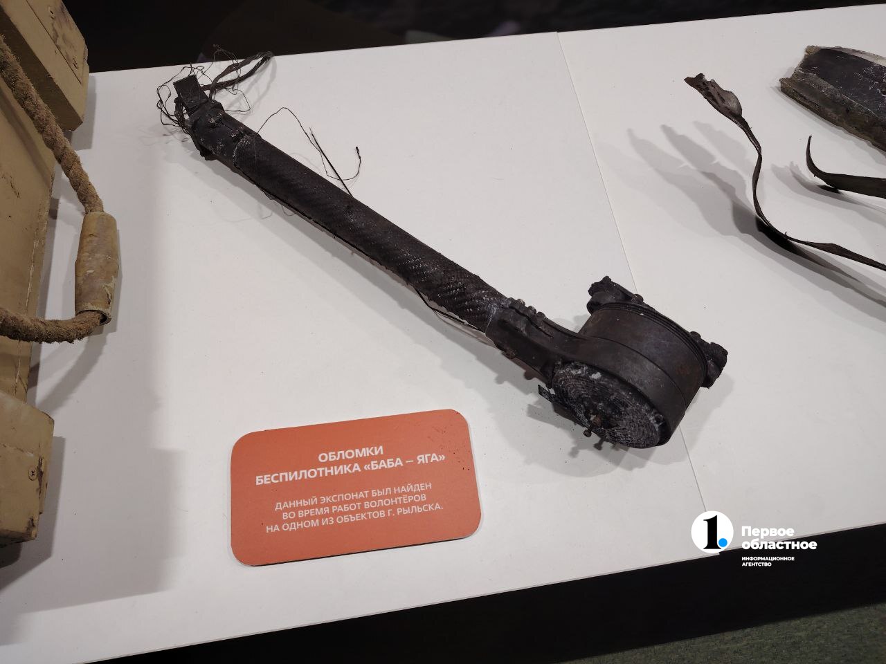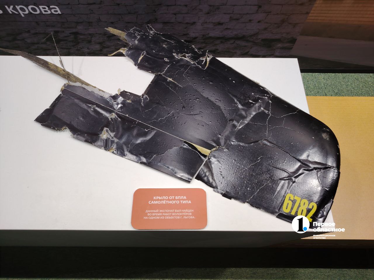 Стенд, посвященный масштабной программе поддержки пострадавшей от ВСУ Курской области, показывает крыло беспилотника, осколки ракеты Himars, обломок дрона «Баба-Яга».