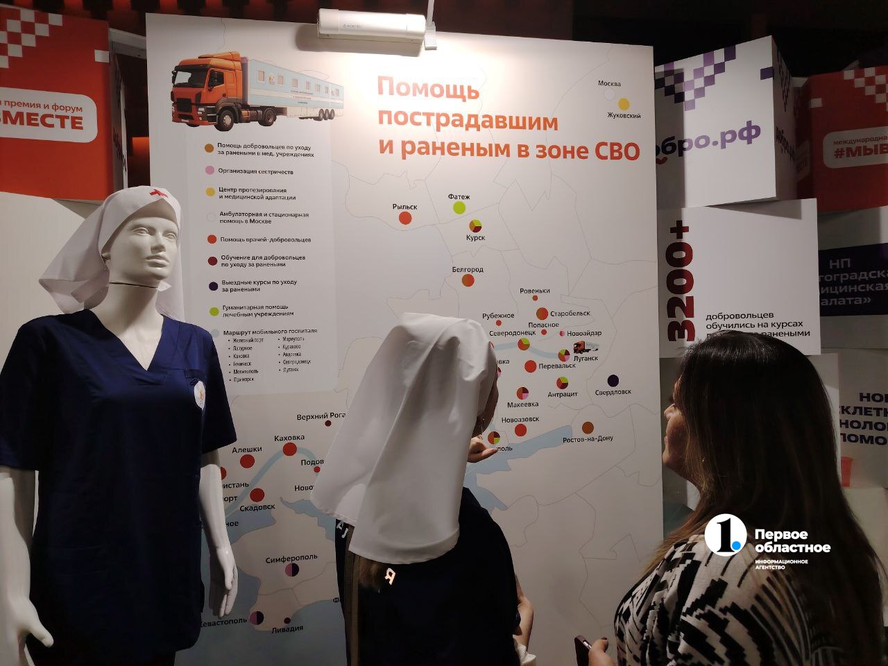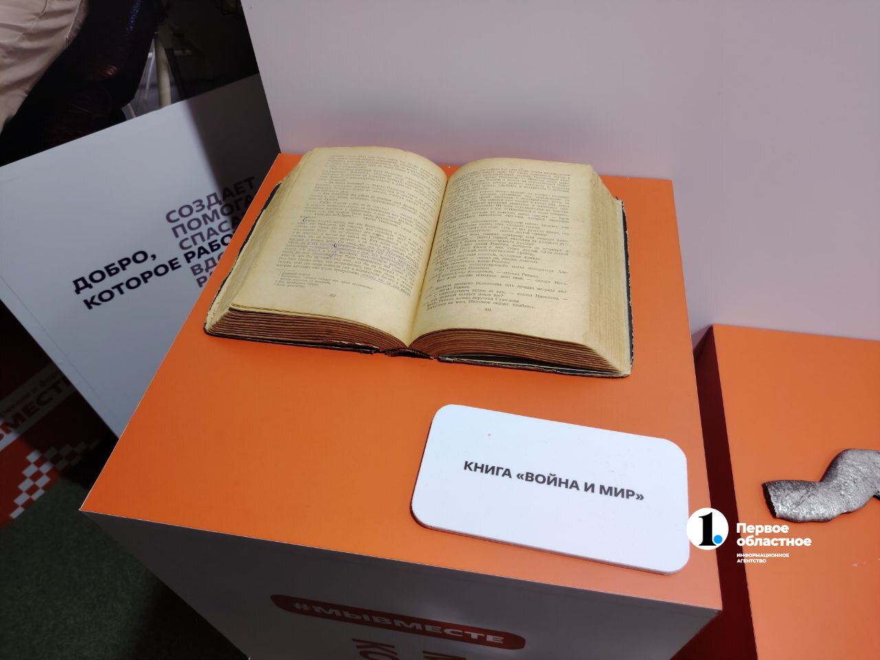 Есть на стенде и книга «Война и мир», изданная в 1951 году и найденная в одной из школ Донбасса. В этой же зоне можно услышать обращения к волонтерам от бойцов. Гостям форума демонстрируют карту приграничных территорий и мест в зоне СВО, где волонтеры оказывают помощь местным жителям.