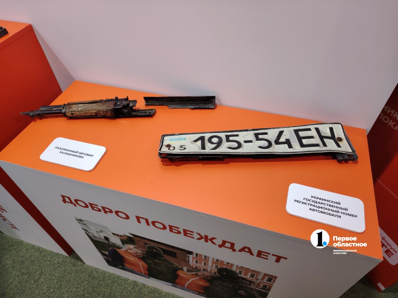 На стенде «СВОими глазами» в качестве символов сражений представлены расплавленный кусок металла, из которого сделан каток украинского танка, разорванный автомат Калашникова, украинский автономер, брошенный жителями Мариуполя при эвакуации.