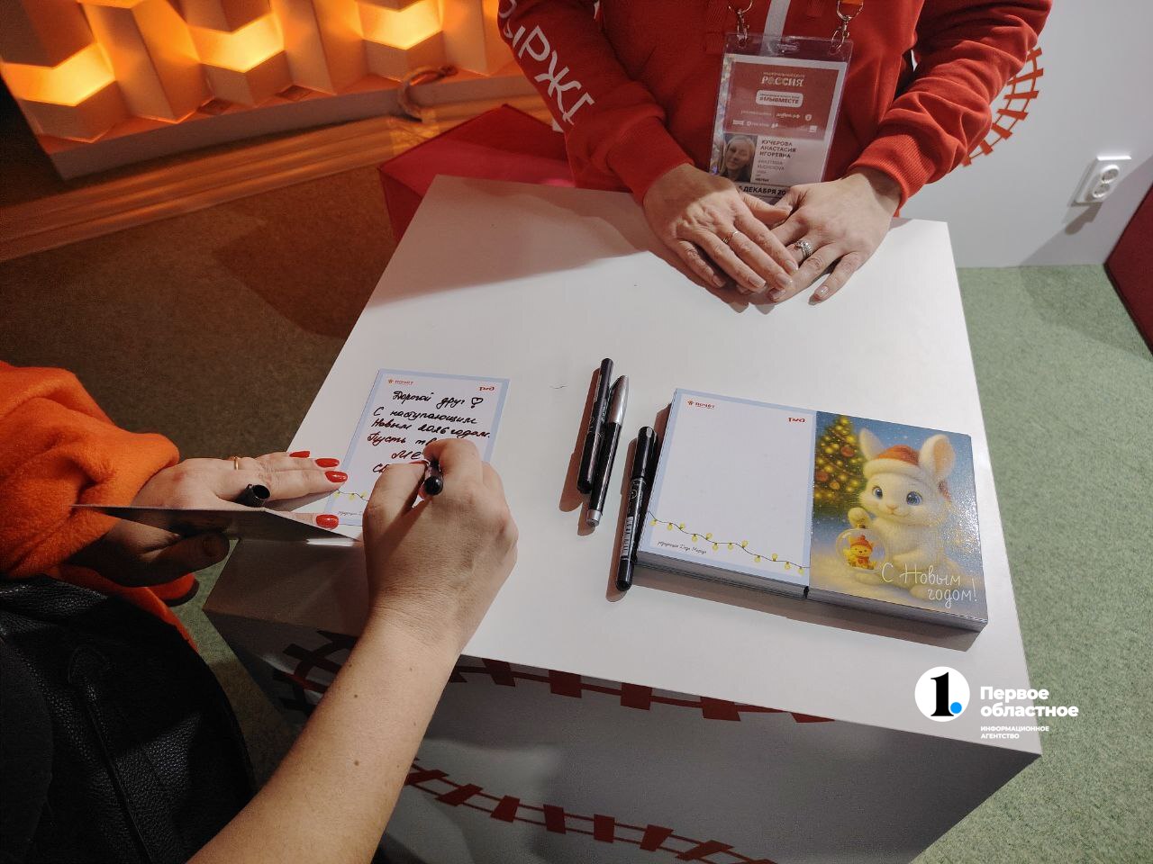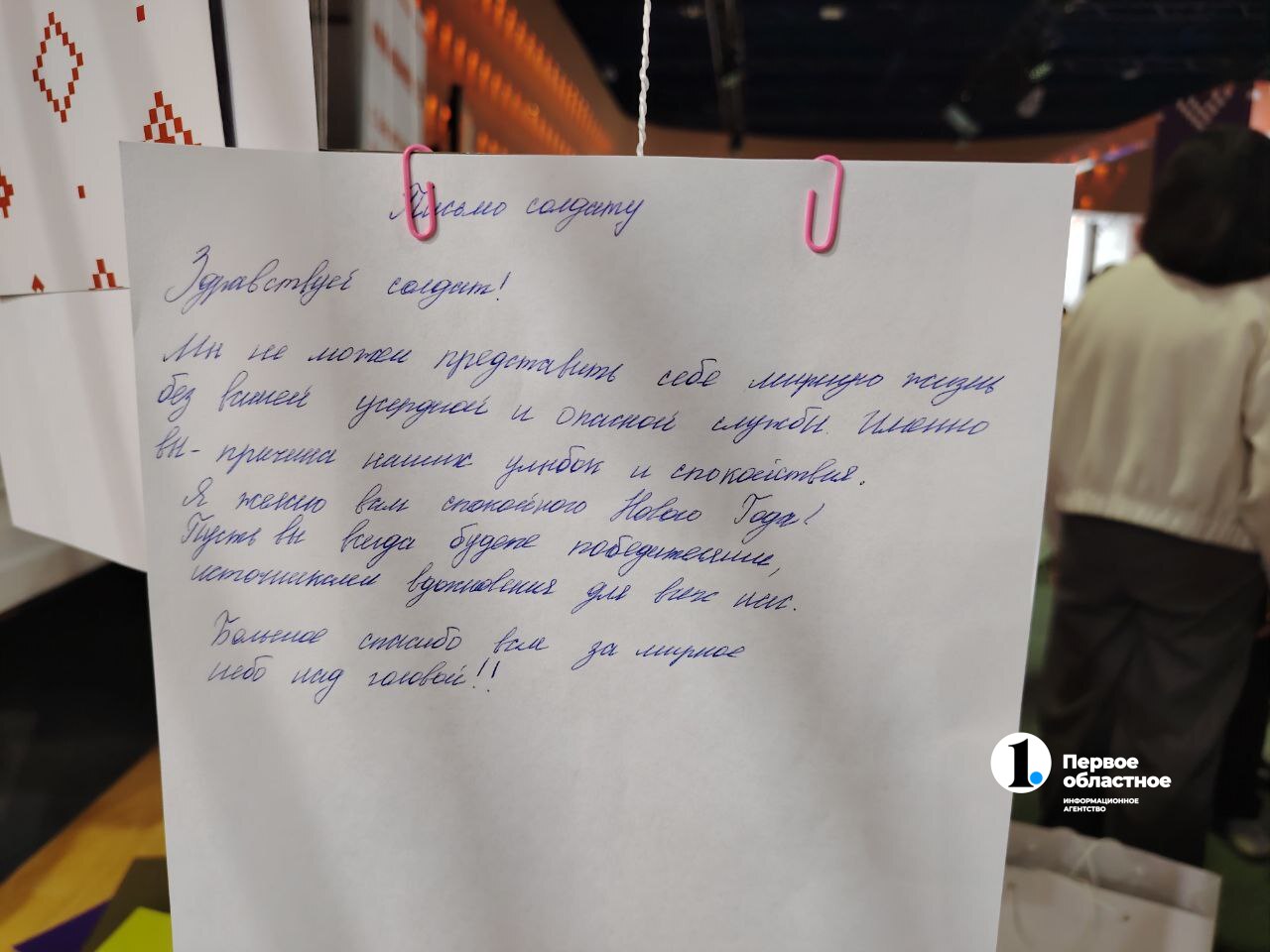 На одной из стоек можно подписать открытку военному или другому волонтеру. Многие пишут письма бойцам СВО, сидя за деревянным столом у импровизированного грузовика. Эти весточки запечатывают в конверты, которые отправят на передовую. Некоторые письма вывешены на веревочках над столом. Строки настолько трогательные, что наворачиваются слезы.