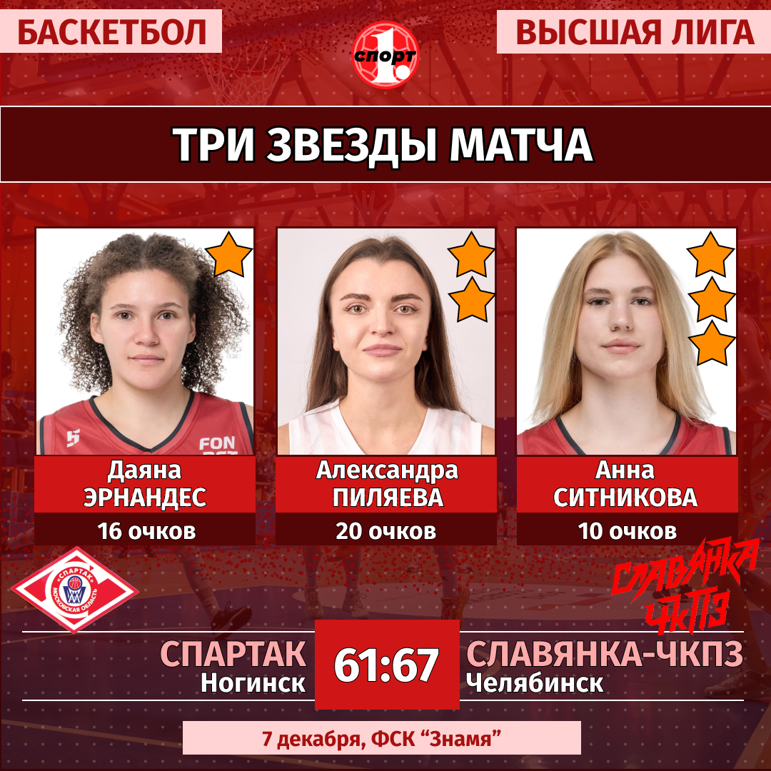 Баскетбол. Сезон-2025/2026. Высшая лига. Женщины. 7 декабря. «Спартак» (Ногинск) — «Славянка-ЧКПЗ» (Челябинск) — 61:67 (14:22, 16:18, 12:18, 19:9).