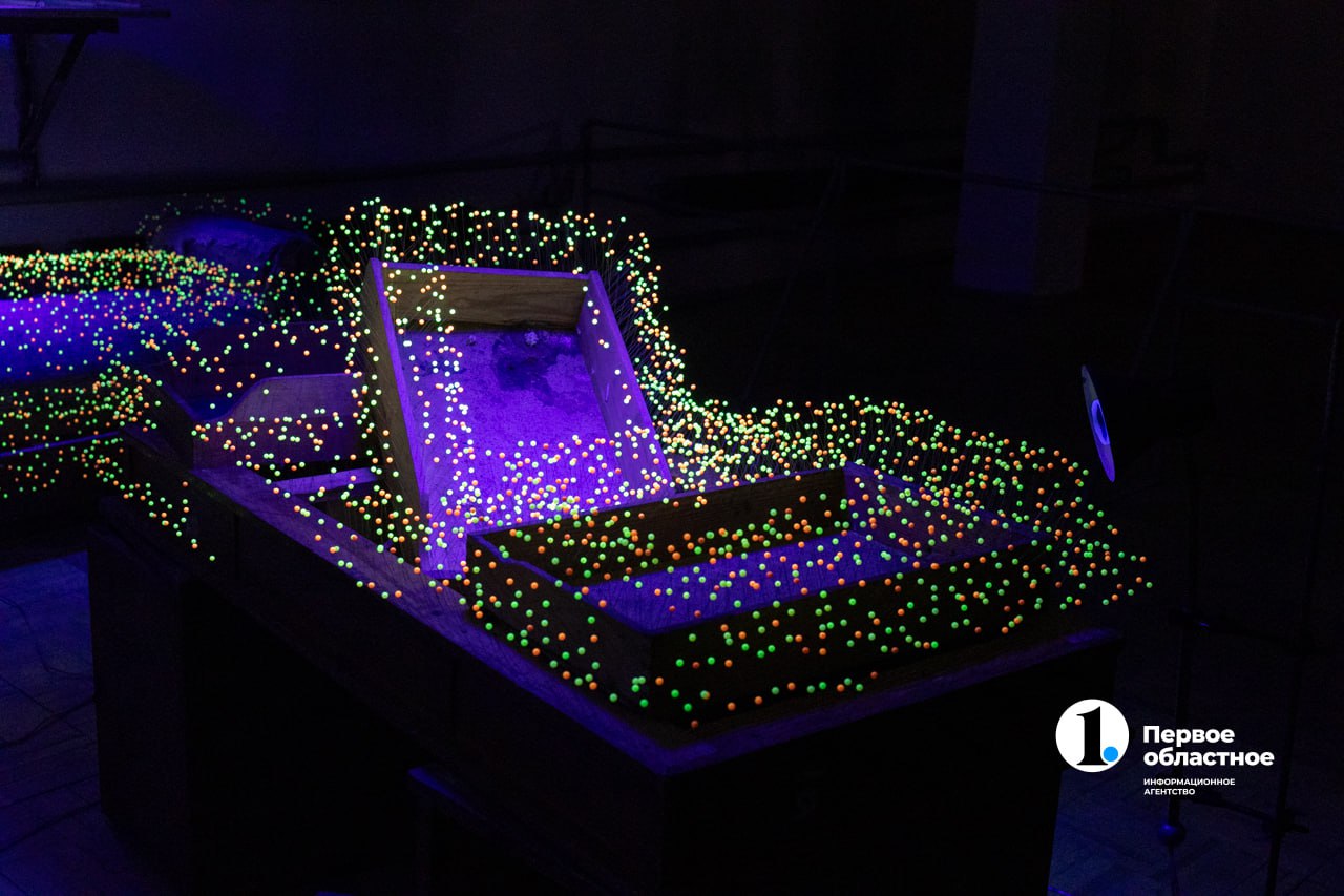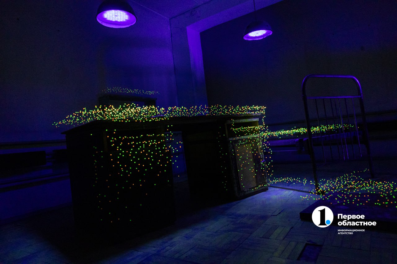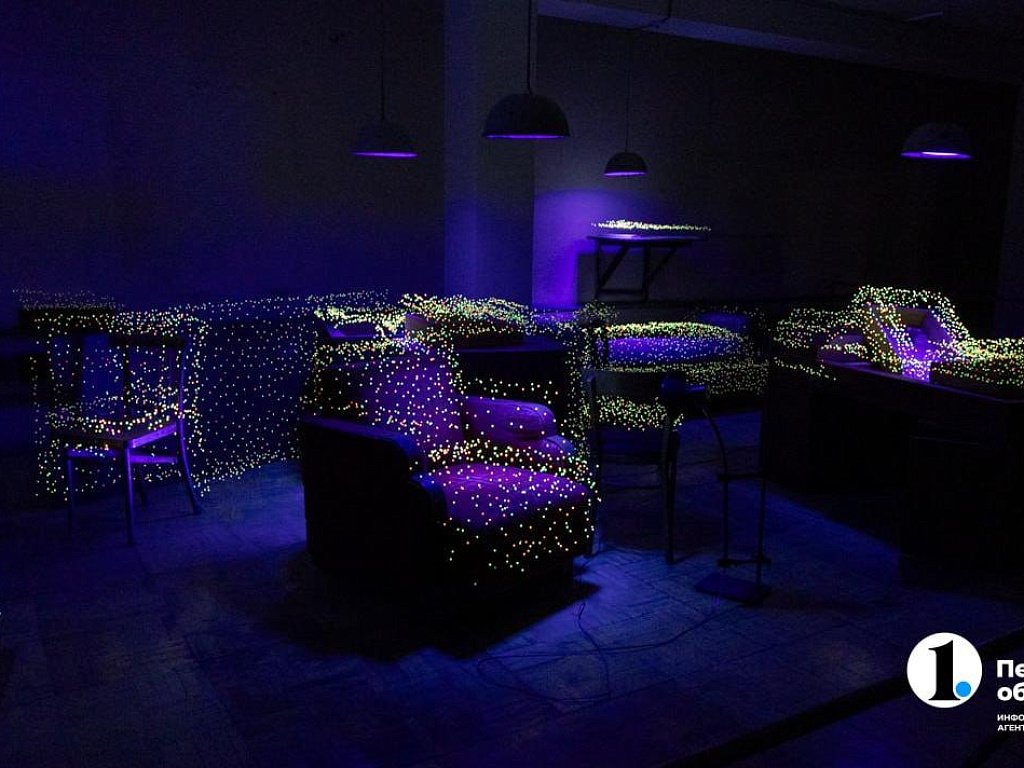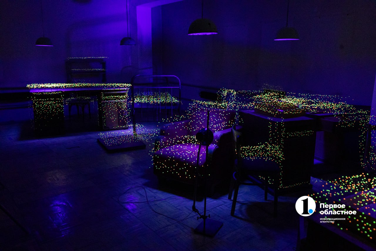 Сама инсталляция — всего одна комнатка, погруженная в темноту. Здесь хаотично расставлены кровать, стулья, столы, тумбочки. Каждая усыпана маленькими разноцветными лампочками — как бы радиационным следом. Какие-то вещи поражены больше, какие-то — меньше. Или же это природа прорастает сквозь предметы, оставленные человечеством на долгие годы?