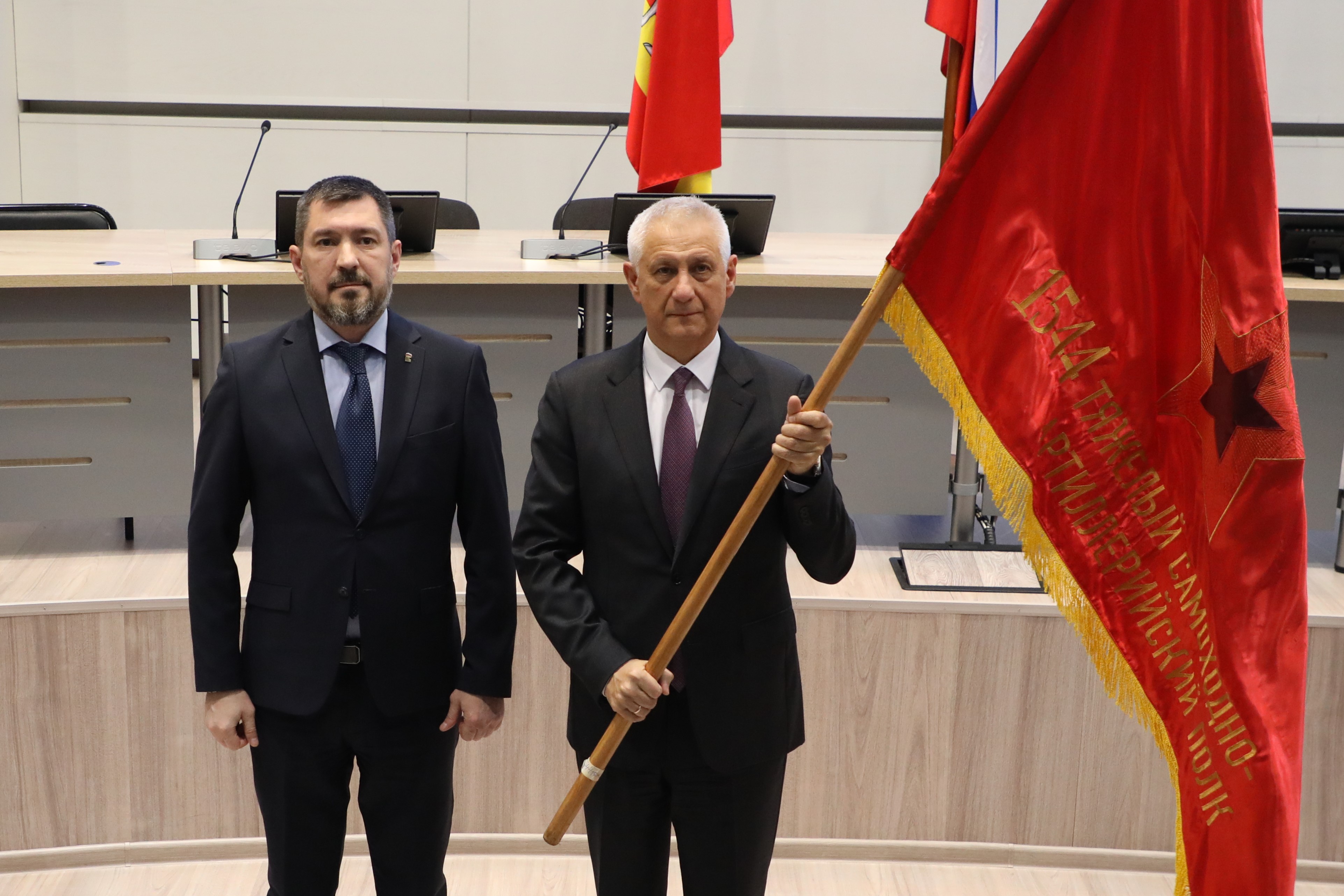 Первый заместитель председателя Законодательного Собрания Денис Моисеев передал на хранение копию боевого знамени 1544-го тяжелого самоходно–артиллерийского полка главе Магнитогорска Сергею Бердникову.