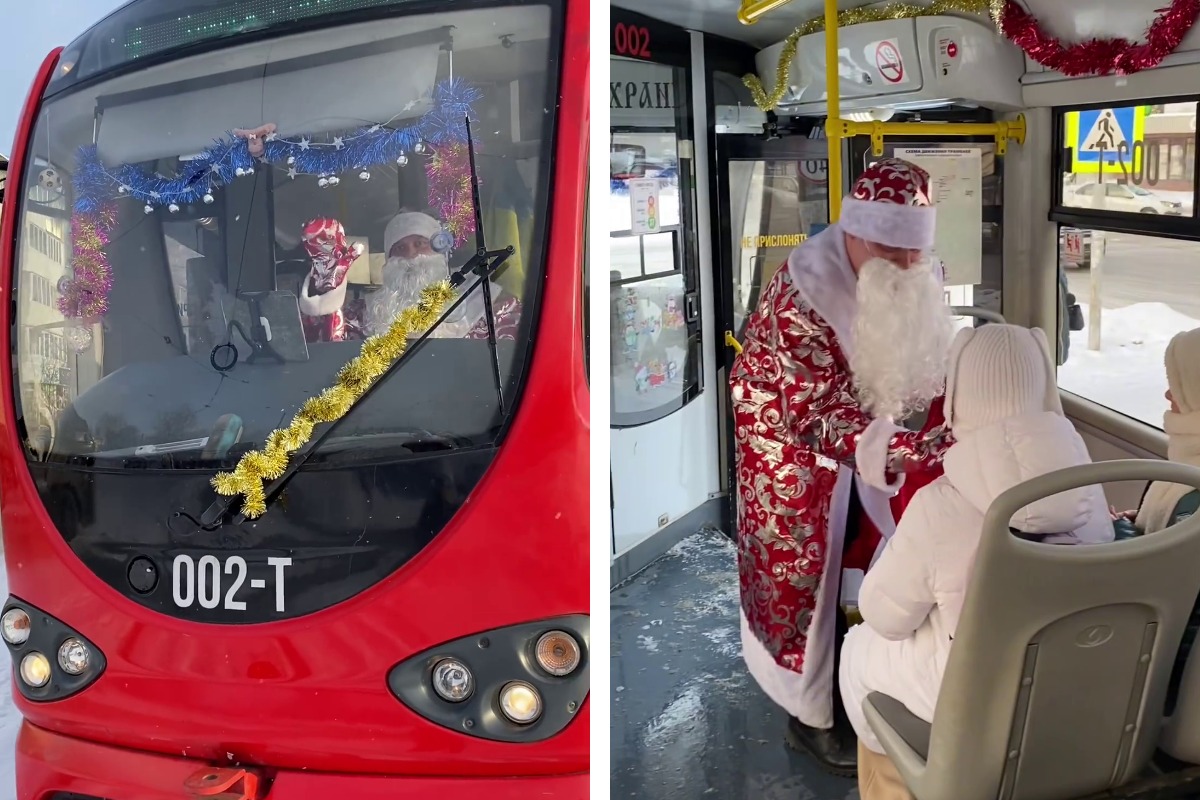 В Магнитогорске Дед Мороз тоже пересел на общественный транспорт. Он ездит в трамваях и автобусах, общается с пассажирами и вручает сладкие подарки тем, кто делится своими новогодними пожеланиями.