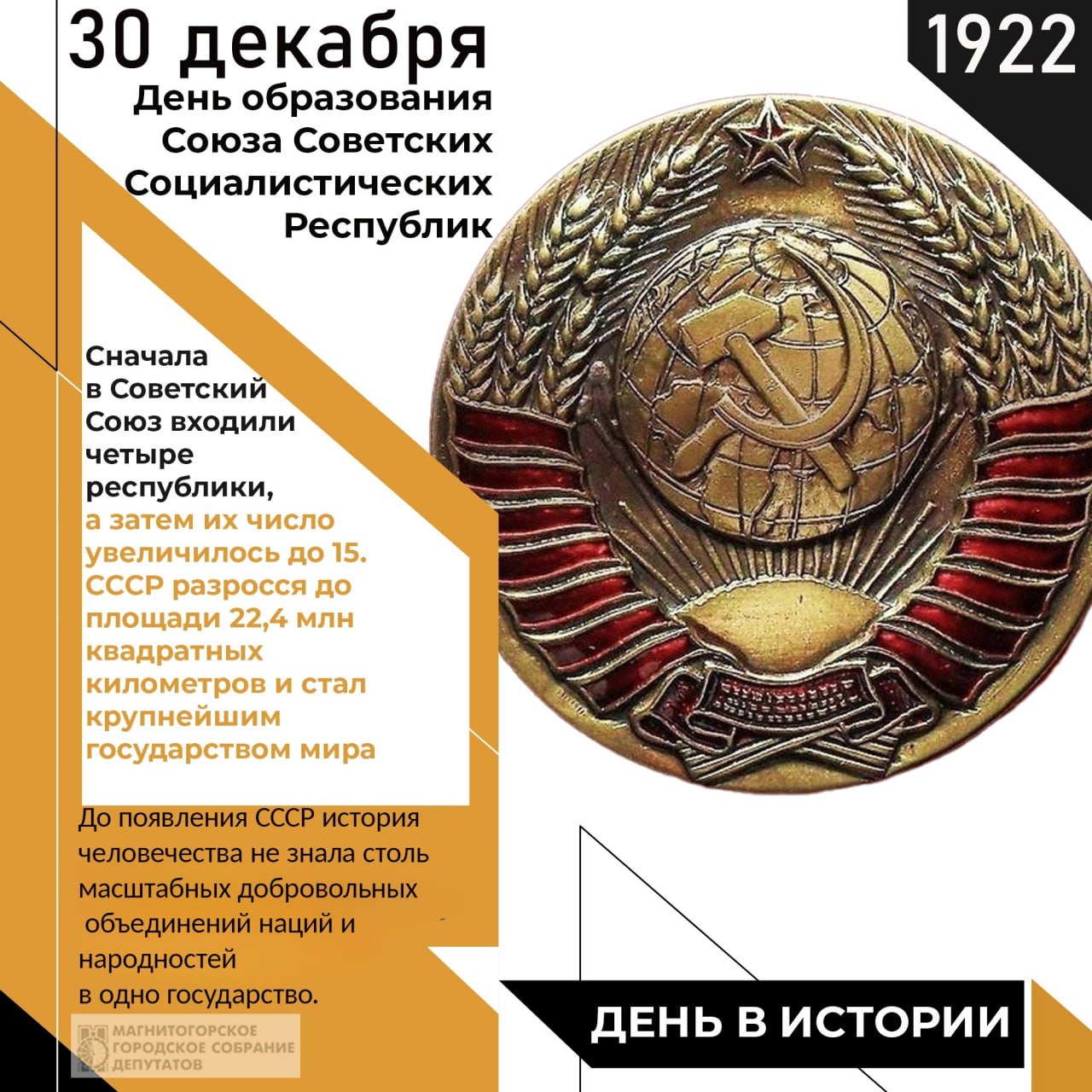 29 декабря 1922 года на конференции делегаций от съездов Советов Российской СФСР, Украинской, Белорусской ССР и Закавказской СФСР был подписан Договор об образовании Союза Советских Социалистических Республик. Утвердили этот документ на следующий день - 30 декабря, и теперь считается, что это дата образования СССР, хотя на формирование разных государственных органов тогда ушло ещё полгода. Съезд избрал первый орган власти СССР — союзный Центральный исполнительный комитет, в который вошли по пять человек от каждой республики. Гимном Союза стал «Интернационал», а государственным флагом — красное знамя.