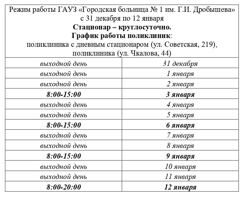График работы поликлиник городской больницы № 1 имени Г. И. Дробышева (ул. Чкалова, 44 и ул. Советская, 219) в новогодние праздники.