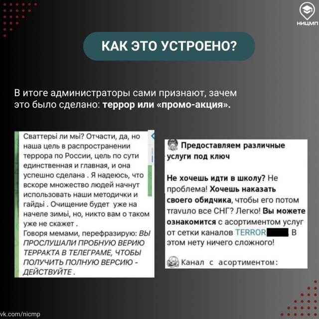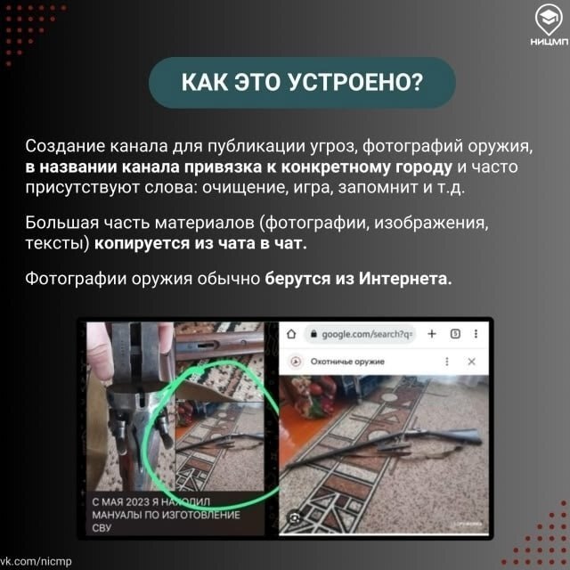 Сообщения распространяются в социальных сетях и мессенджерах в виде репостов из «специальных» каналов и чатов. Это транслируется, в том числе в форме массовых рассылок в школьные чаты для детей и родителей. Чаще всего заведомо ложное сообщение об угрозе теракта поступает относительно объектов с массовым скоплением людей: школы, колледжи, вузы, торгово-развлекательные комплексы и т.д.