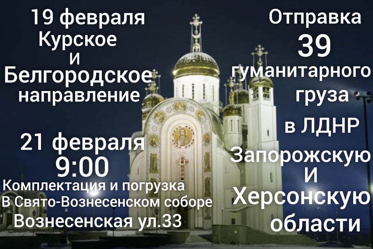 В воскресенье, 21 февраля, в 09:00 в Храме Свято-Вознесенского собора (ул. Вознесенская, 33) состоится комплектация и погрузка 39го гуманитарного груза. Отправка — на Курское и Белгородское направления.