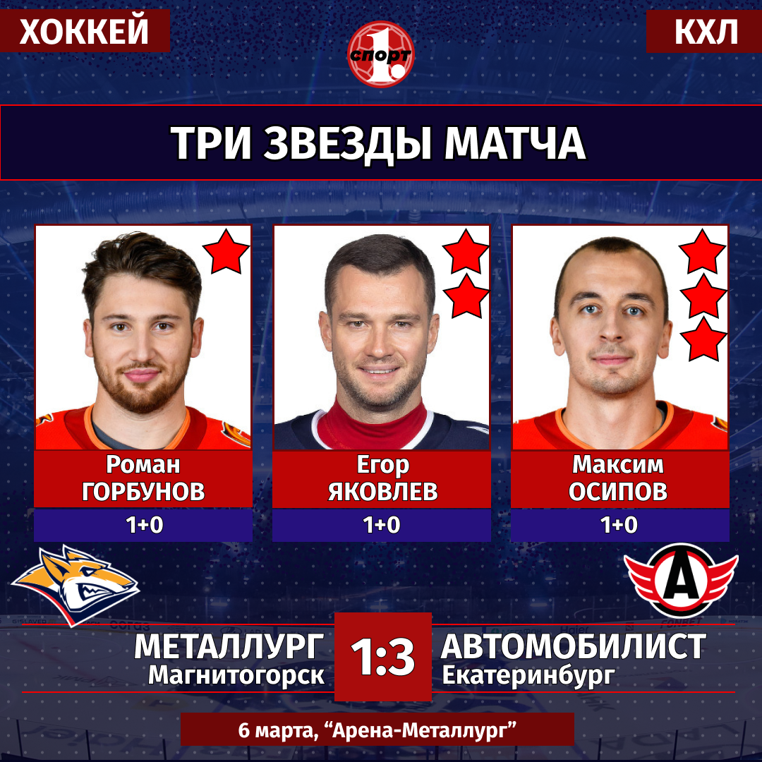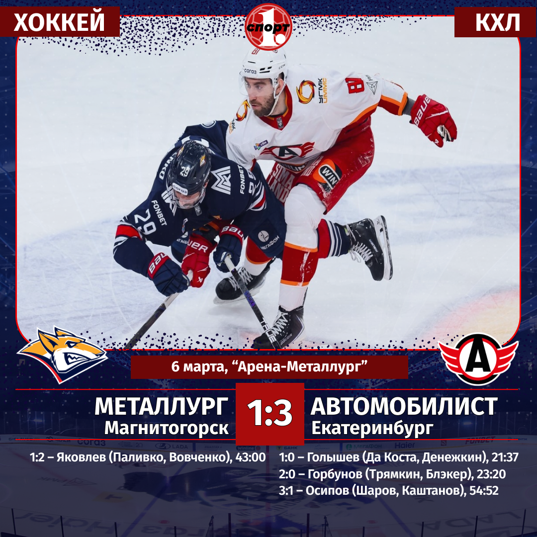 Хоккей. Сезон-2025/2026. Чемпионат КХЛ. 6 марта. «Металлург» (Магнитогорск) — «Автомобилист» (Екатеринбург) — 1:3 (0:0, 0:2, 1:1).
