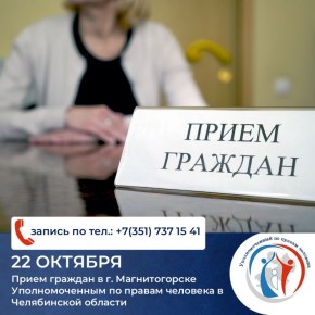 В Магнитогорске состоится личный прием Уполномоченного по правам человека в Челябинской области Юлии Сударенко.Прием будет проходить 22 октября с 12 часов в здании администрации города по адресу проспект Ленина, 72.