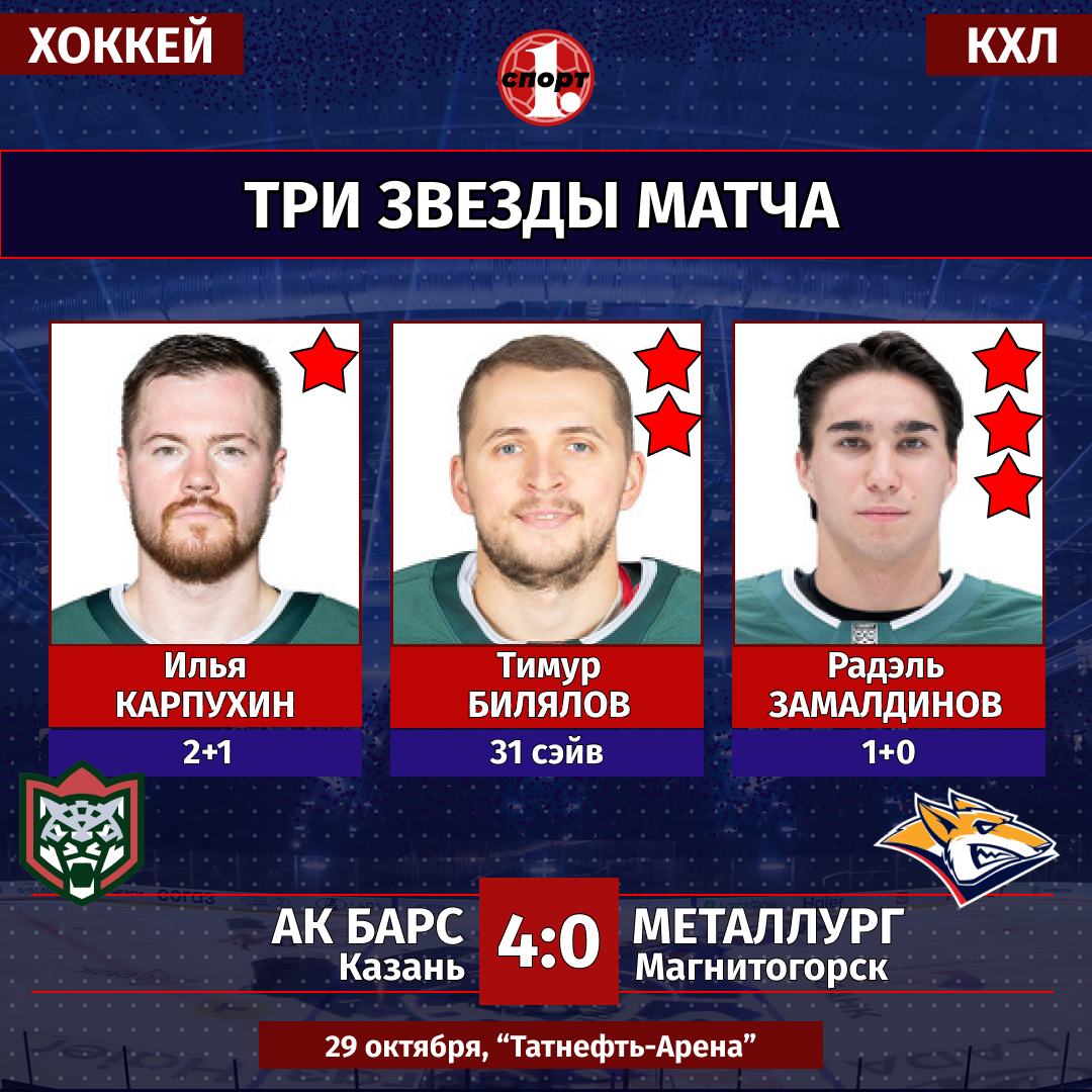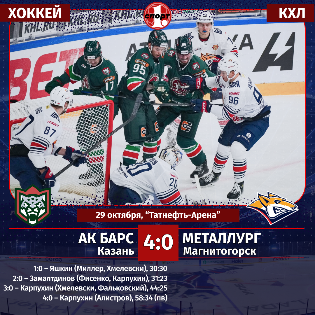 Хоккей. Сезон-2025/2026. Чемпионат КХЛ. 29 октября. «Ак Барс» (Казань) — «Металлург» (Магнитогорск) — 4:0 (0:0, 2:0, 2:0).