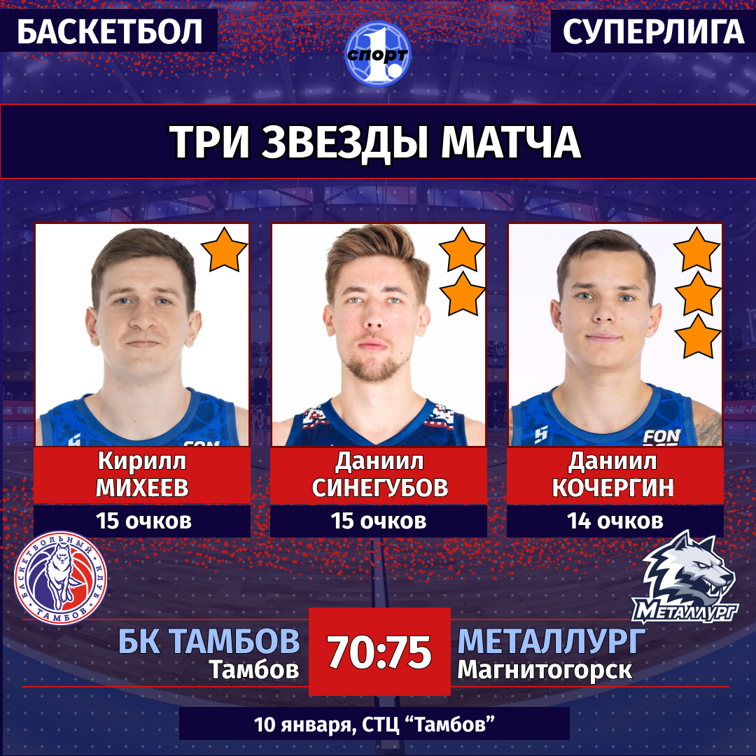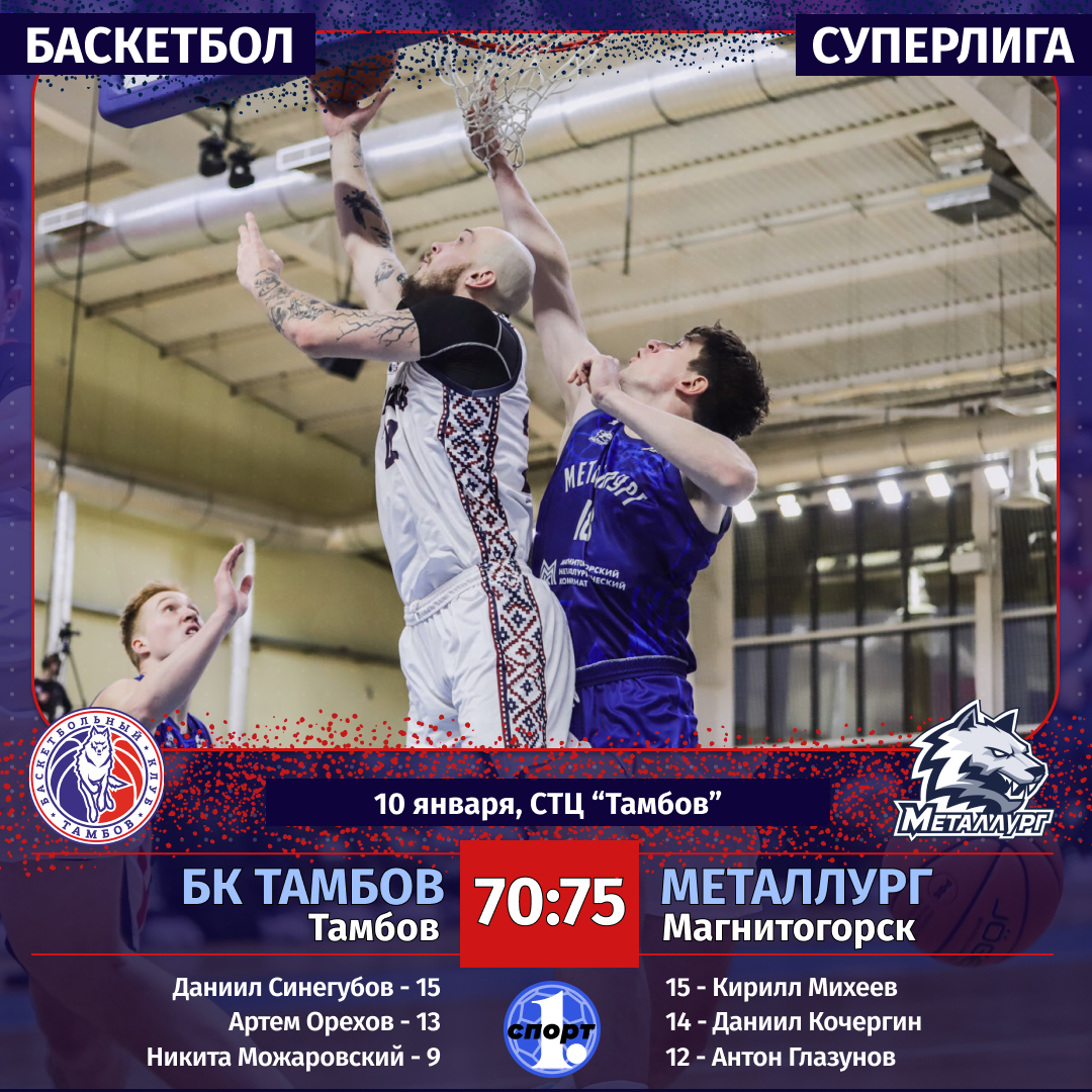 Баскетбол. Сезон-2025/2026. Суперлига. Мужчины. 10 января. БК «Тамбов» (Тамбов) — «Металлург» (Магнитогорск) — 70:75 (13:18, 27:22, 16:18, 14:17).