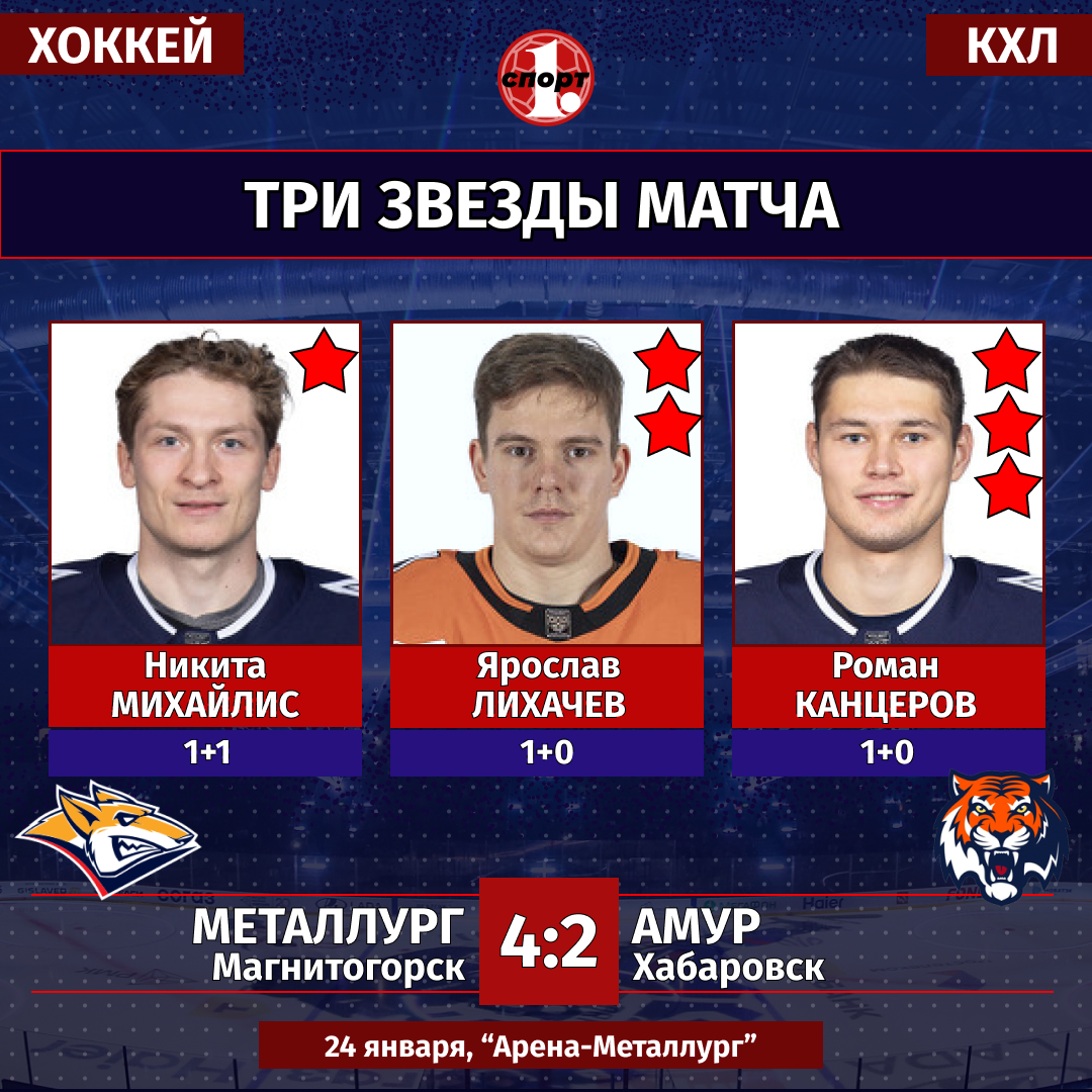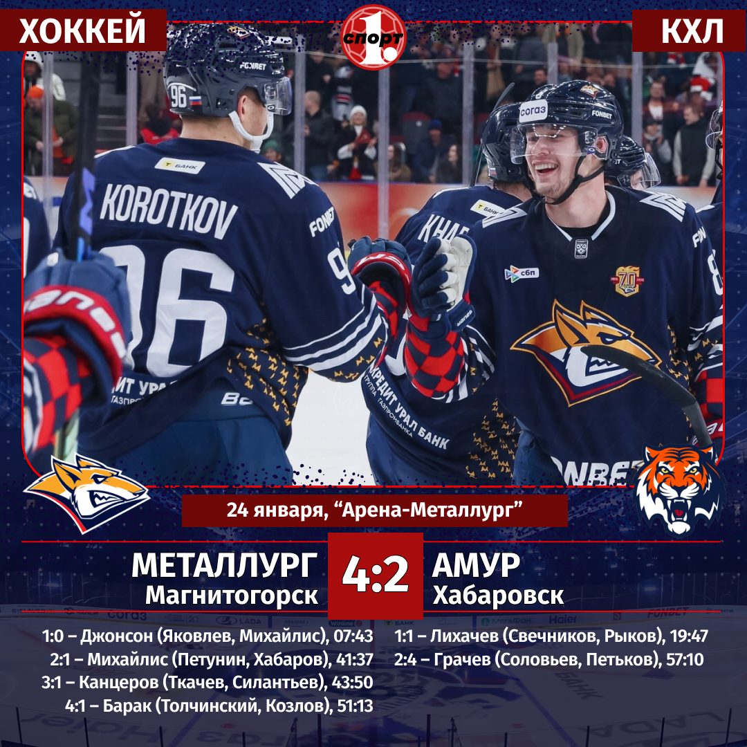 Хоккей. Сезон-2025/2026. Чемпионат КХЛ. 24 января. «Металлург» (Магнитогорск) — «Амур» (Хабаровск) — 4:2 (1:1, 0:0, 3:1).