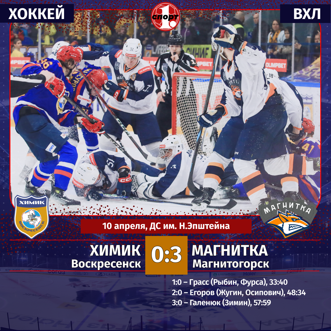 Хоккей. Сезон-2025/2026. ВХЛ. Плей-офф. Четвертьфинал. 1-й матч. 10 апреля. «Химик» (Воскресенск) — «Магнитка» (Магнитогорск) — 0:3 (0:0, 0:1, 0:2).