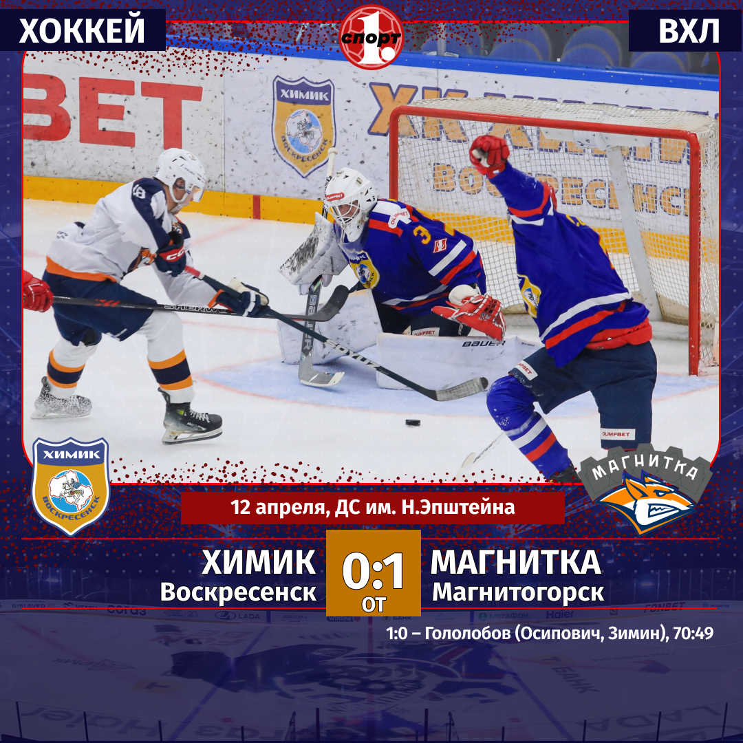 Хоккей. Сезон-2025/2026. ВХЛ. Плей-офф. Четвертьфинал. Второй матч. 12 апреля. «Химик» (Воскресенск) — «Магнитка» (Магнитогорск) — 0:1 от (0:0, 0:0, 0:0, 0:1).